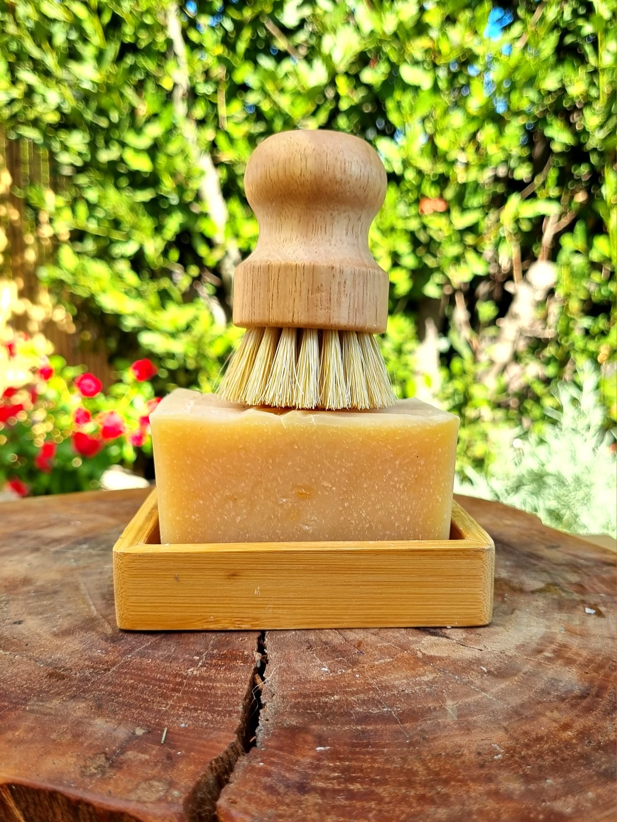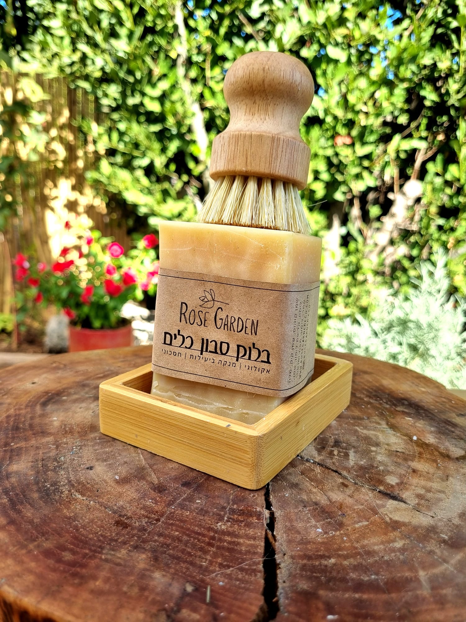 מארז אקולוגי למטבח – סבון כלים טבעי מוצק, מברשת וסבוניית עץ ייעודית