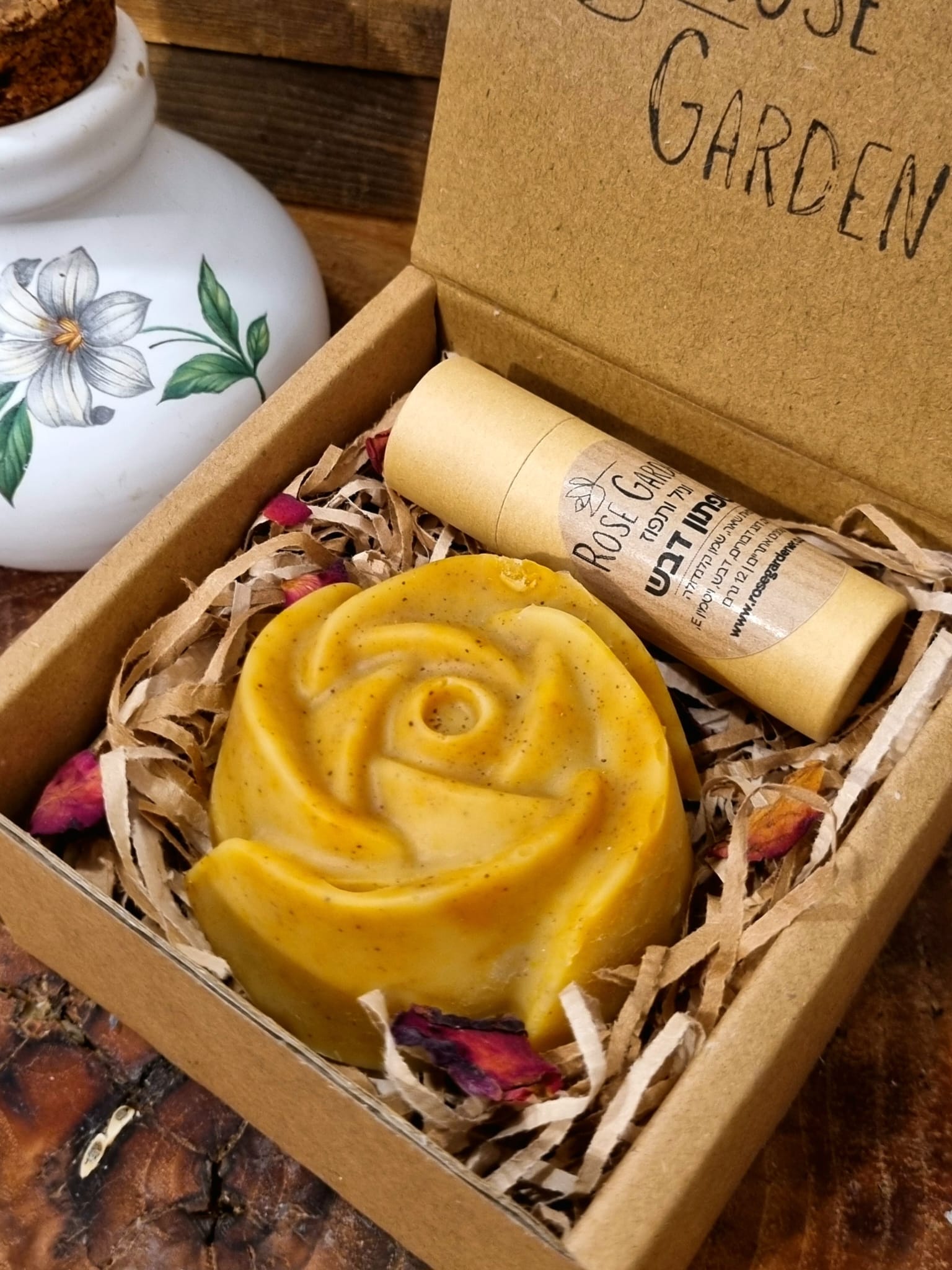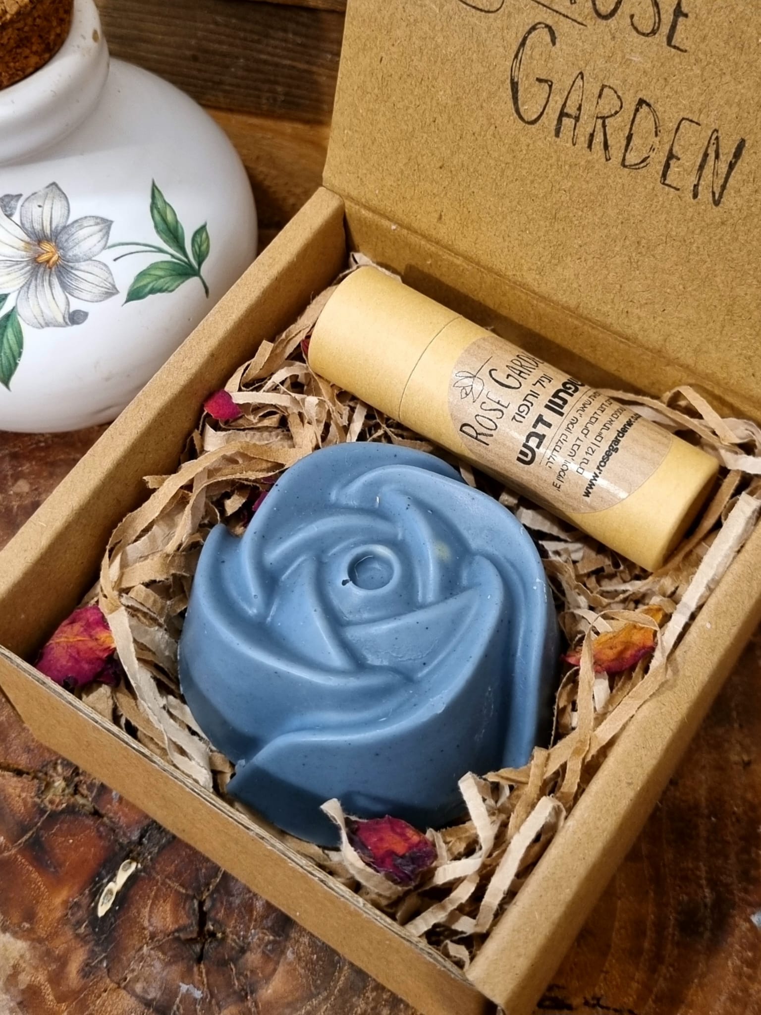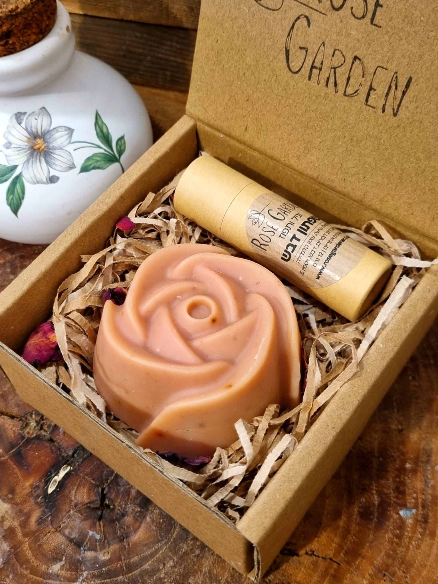 מארז עדין ומחבק, הכולל סבון ורד קטן ושפתון טבעי מזין. מושלם כתודה, כפינוק לעובדת או כמתנה קטנה לעצמך.